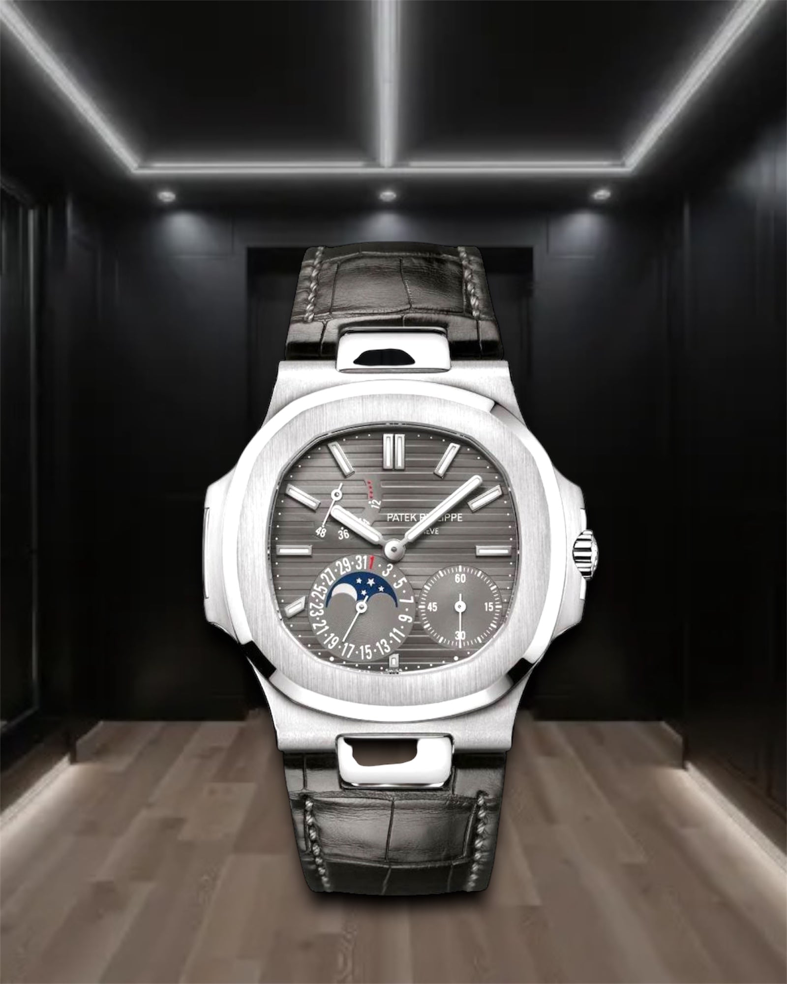Patek Philippe Nautilus Power Reserve Moon Phase Steel Grey Dial Leather Strap 40.5mm